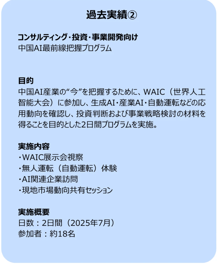 - 2日目:先進企業訪問・実装現場視察(社会実装レベルを確認)