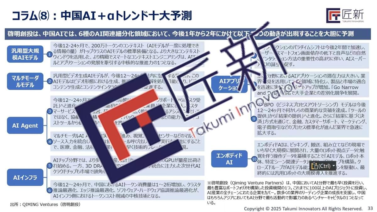 3. 「大規模AIモデルの応用」「エンボディドAI」といった概念を中核とし、AI Agents、人型ロボット、外骨格ロボット、AI+AR メガネ、AI チップなどの分野における技術発展と社会実装(AI が技術的な壁を越え、大規模な経済・社会システムに参入。)が大規模に普及かつ一般化。